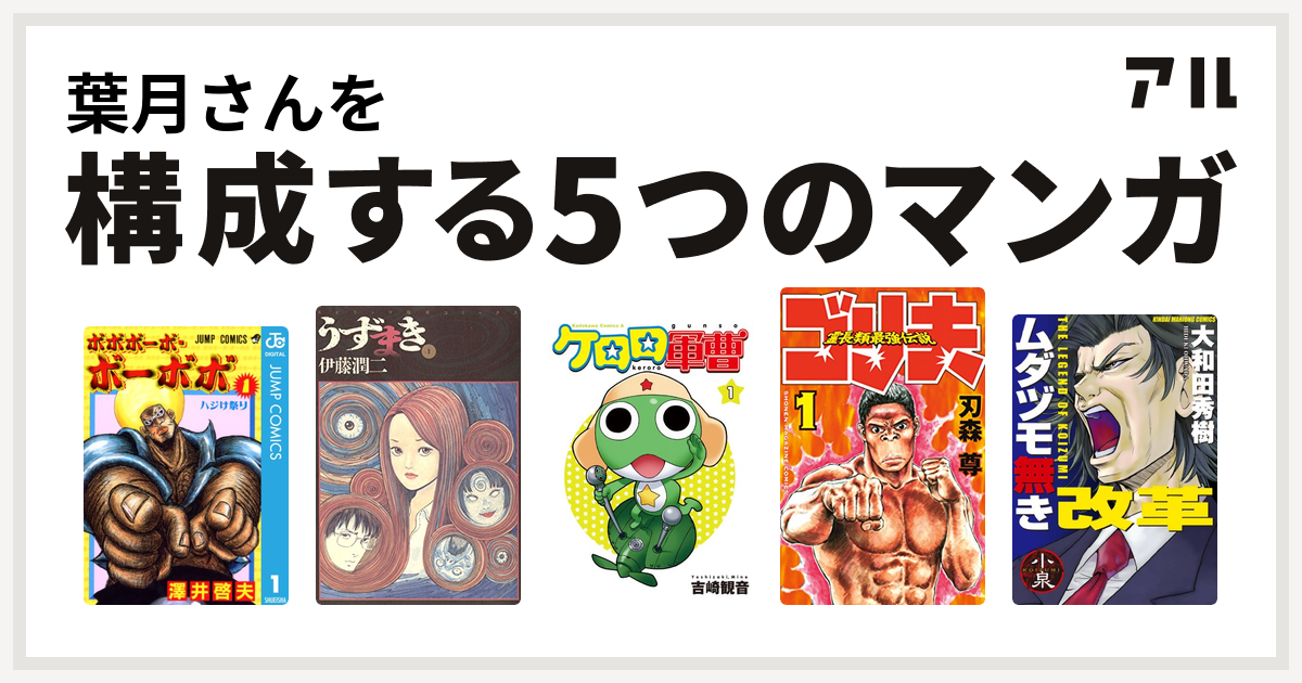 葉月さんを構成するマンガはボボボーボ ボーボボ うずまき ケロロ軍曹 霊長類最強伝説 ゴリ夫 ムダヅモ無き改革 私を構成する5つのマンガ アル